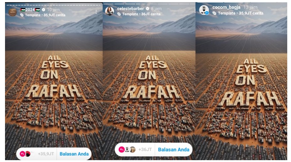 Berawal ketika buka beranda akun instaram, saya dikejutkan dengan tampilan tersebut. Semakin mensecrooll, semakin bertemu taburan story dengan gambar yang sama. Baru saya pahami ketika saya dapati tentang postingan yang mengabarkan adanya tragedi Rafah. Saya mengulang kembali untuk melihat template story dari akun yang tadi saya jumpai.