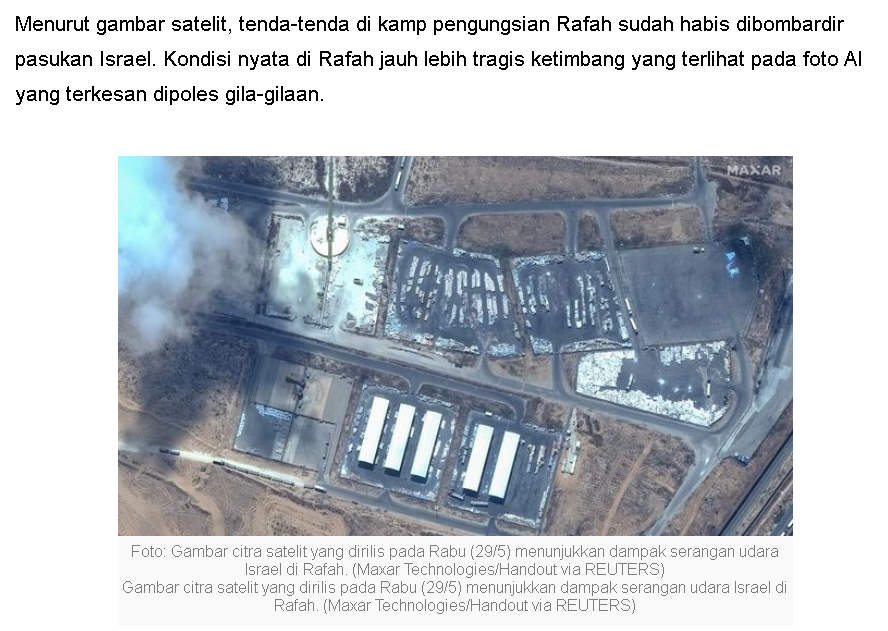 Secara visual, template yang bertuliskan All Eyes on Rafah ciptaan Ai tersebut tidak mewakili apapun dengan konteks sebenarnya yang terjadi di Rafah kecuali padang gurun. Saya Kembali memastikan dugaan ini dengan berselancar sekedar kepo untuk mencari keakuratan informasi. Ternyata memang telah menjadi perbincangan banyak versi. Hingga sumber CNBC Indonesia juga memaparkan: