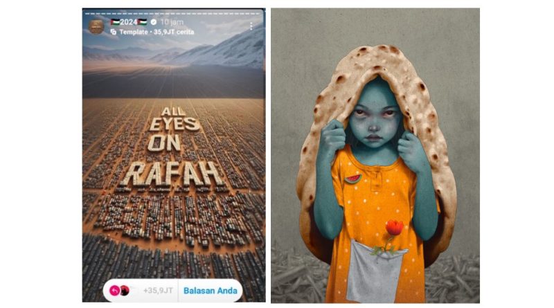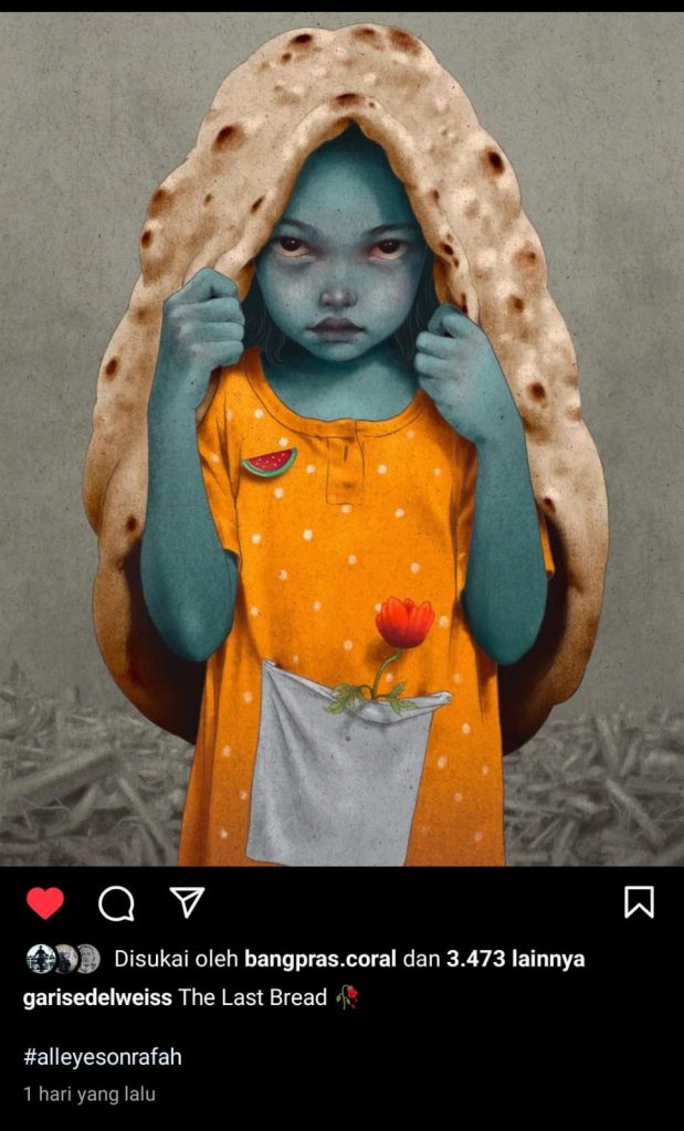 Bergeser ke daerah sendiri, kemarin (30/05/2024) muncul gambar seorang gadis berbaju orange dengan bertudung. Gambar tersebut diberi judul “The Last Bread” artinya Roti terahir. Meskipun juga menggunakan tagar (#alleyesonrafah), gambar tersebut telah disukai tiga ribu sekian orang.