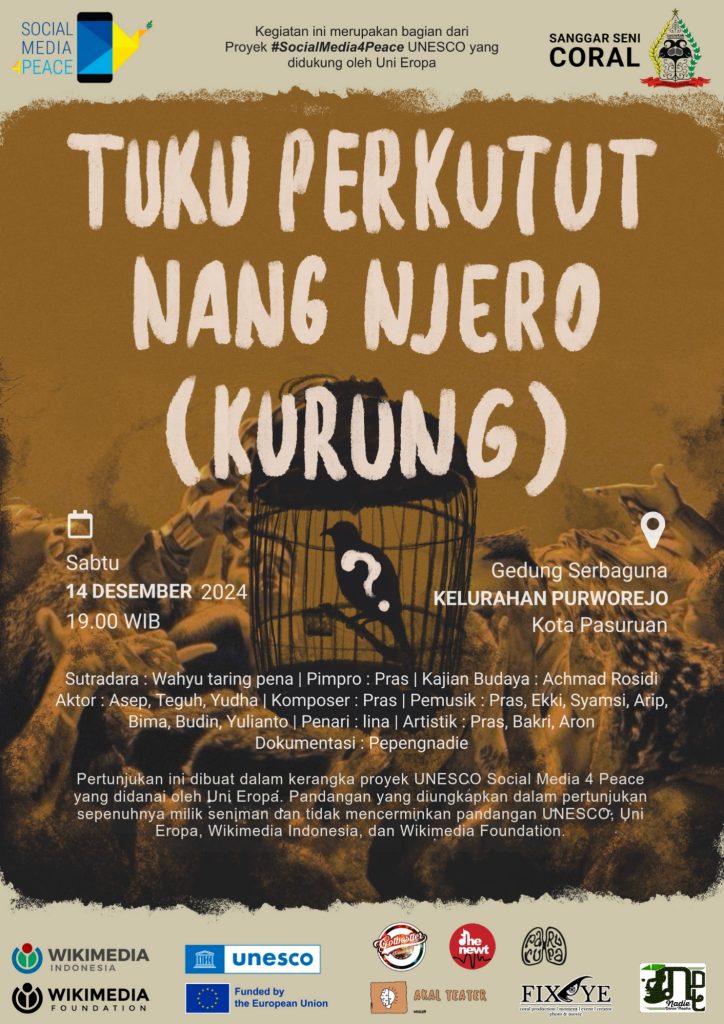 Pasuruan, 14 Desember 2024 – Sanggar Seni Cuci Otak – Rahmat Alam Pasuruan (coral) dengan bangga mempersembahkan adaptasi teater rakyat Terbang Bandung dalam rangka sosialisasi program Social Media for Peace. Pentas akan dilaksanakan di gedung kelurahan Purworejo pukul 19:00 wib. Program yang diinisiasi oleh UNESCO dan didanai oleh Uni Eropa ini bertujuan untuk mendorong penggunaan media sosial sebagai ruang dialog yang mendukung perdamaian dan harmoni sosial.